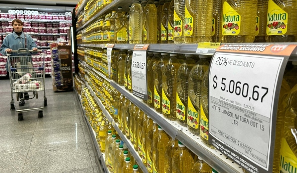 Seorang wanita menolak troli membeli-belah di hadapan minyak bunga matahari yang dijual di sebuah pasar raya di Buenos Aires/Foto AFP